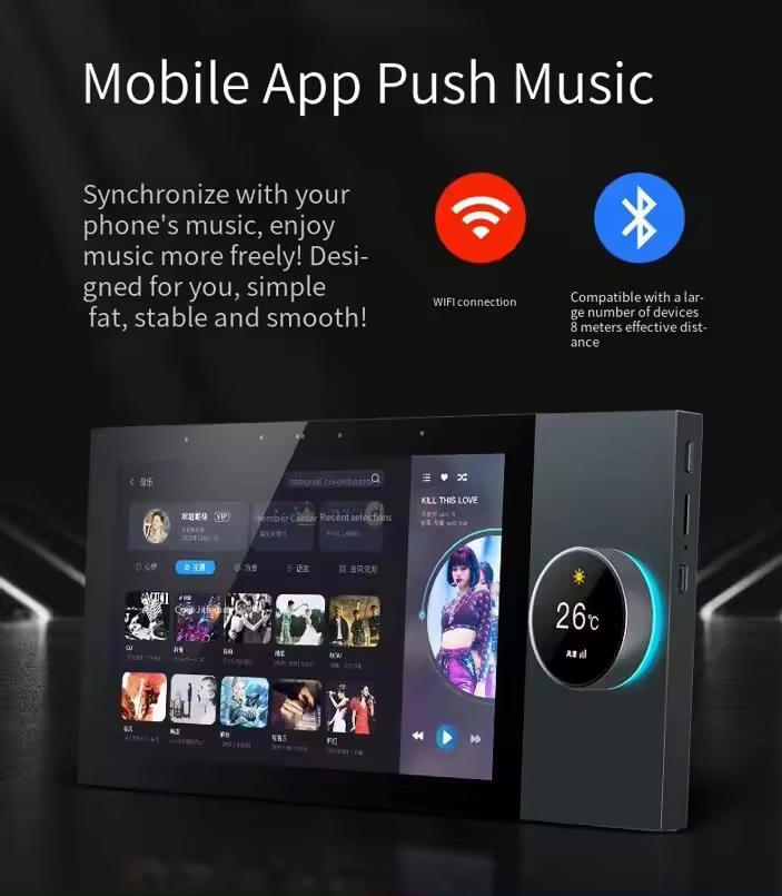 F7 is a tuya smart home gateway with 7 inch touch screen, Android operation system, supports music playback.